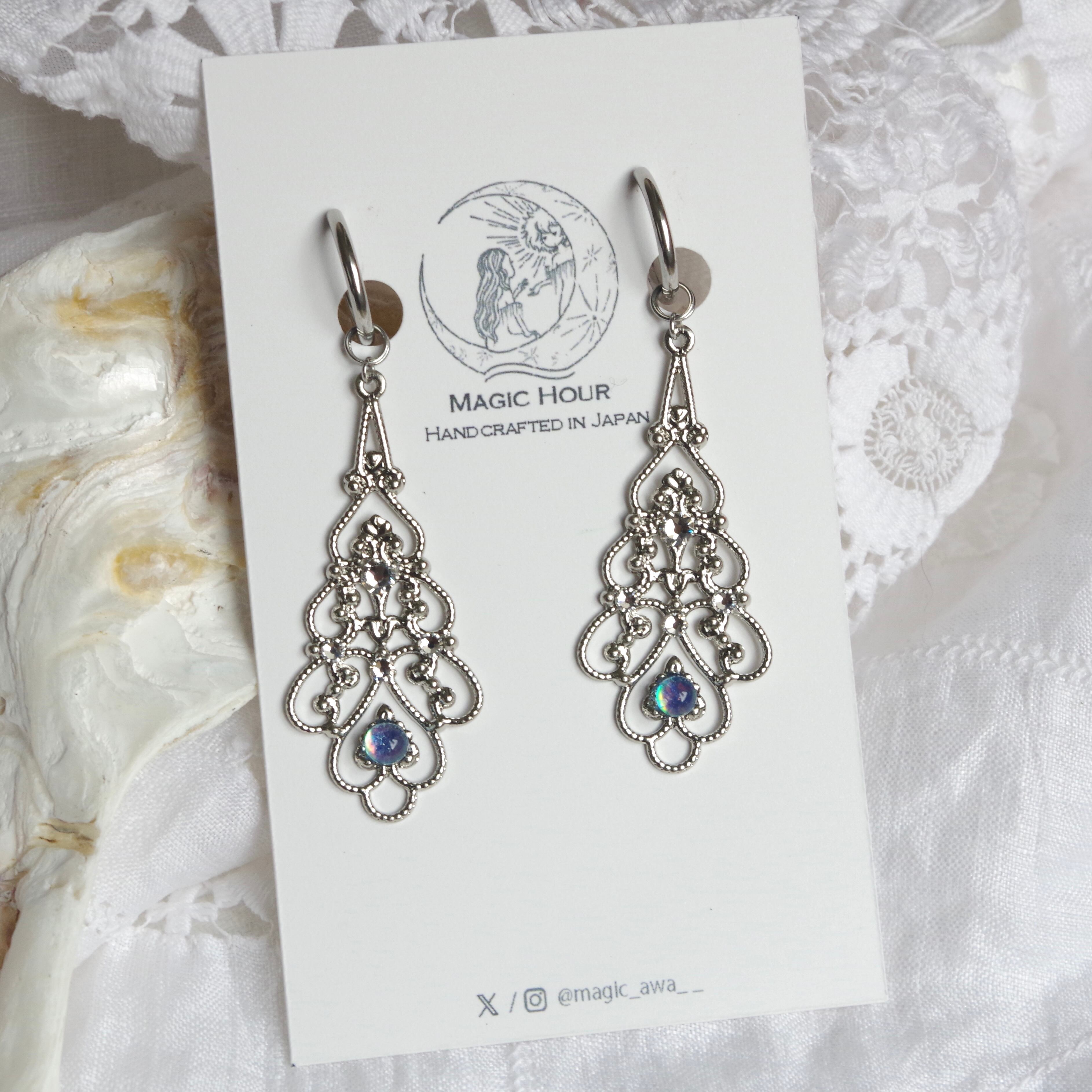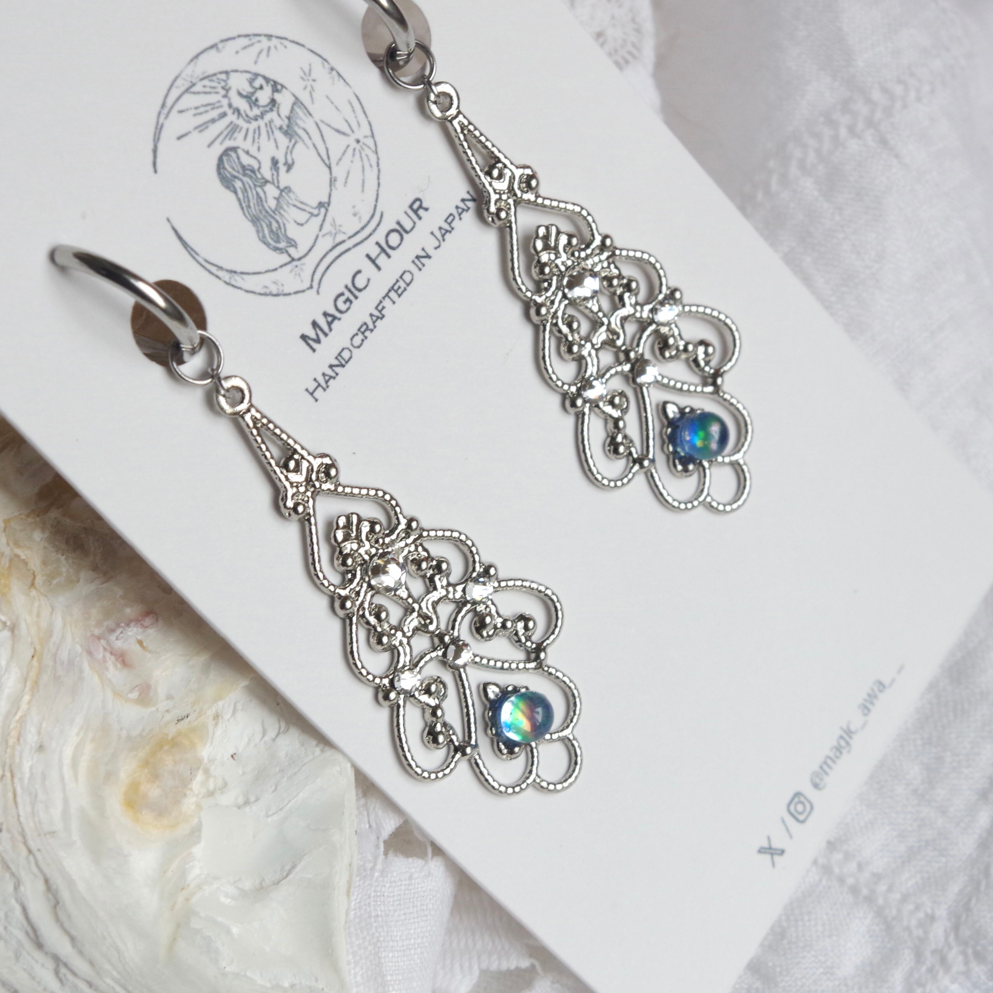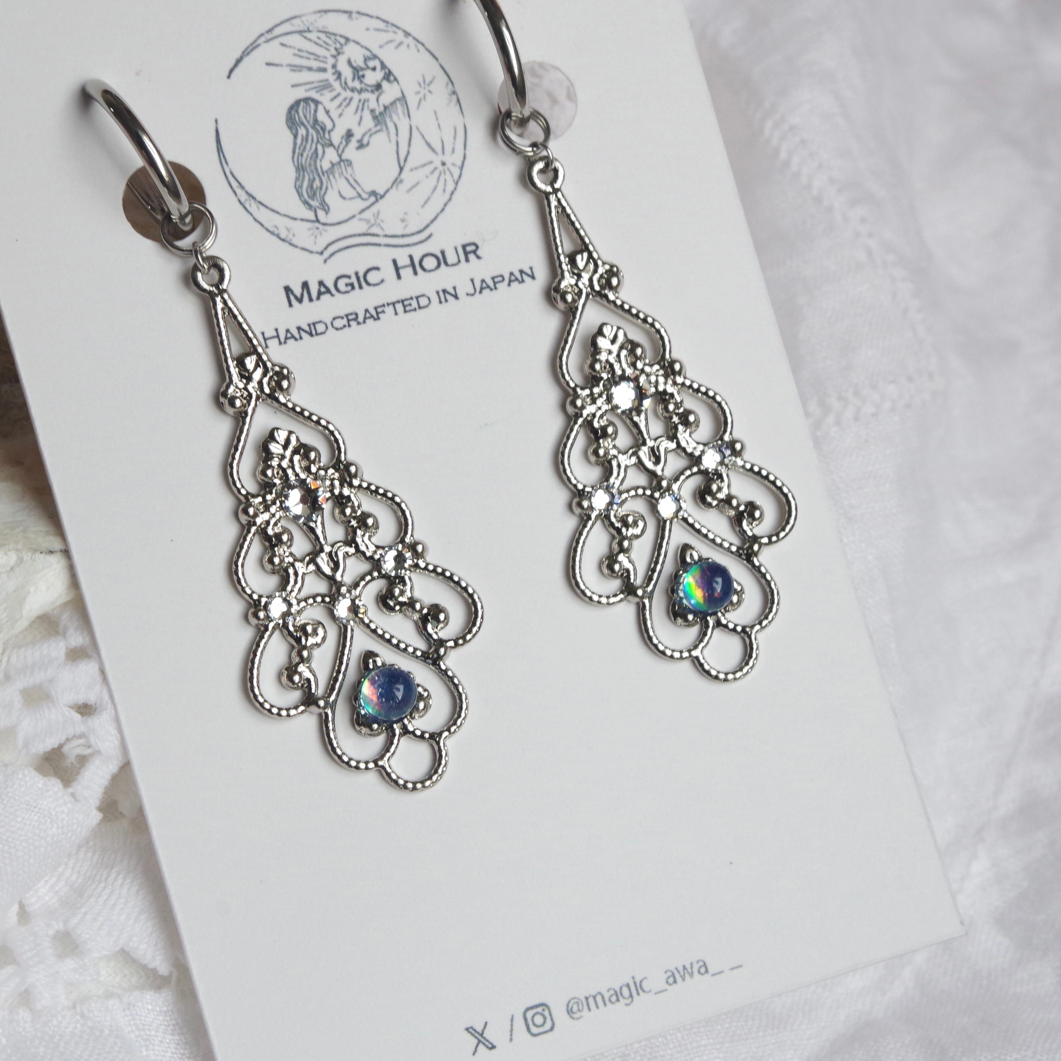 窯で焼いたシーグラスアイテムから、繊細なフィリグリーが美しい"Lune"シリーズが登場しました。スッと落ちる一筋の雫のように美しい耳飾り。
