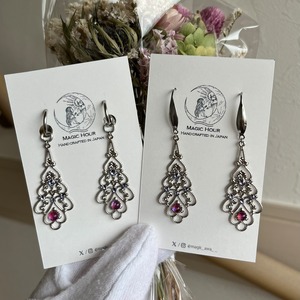 直接耳に触れる金具は錆びにくいサージカルステンレス(SUS316)です。K14、ニッケルフリーなど金属アレルギー対応金属をお探しの方にもおすすめします。ただし全ての方にアレルギー対応を保証するものではありません。※揺れるパーツは真鍮メッキです。