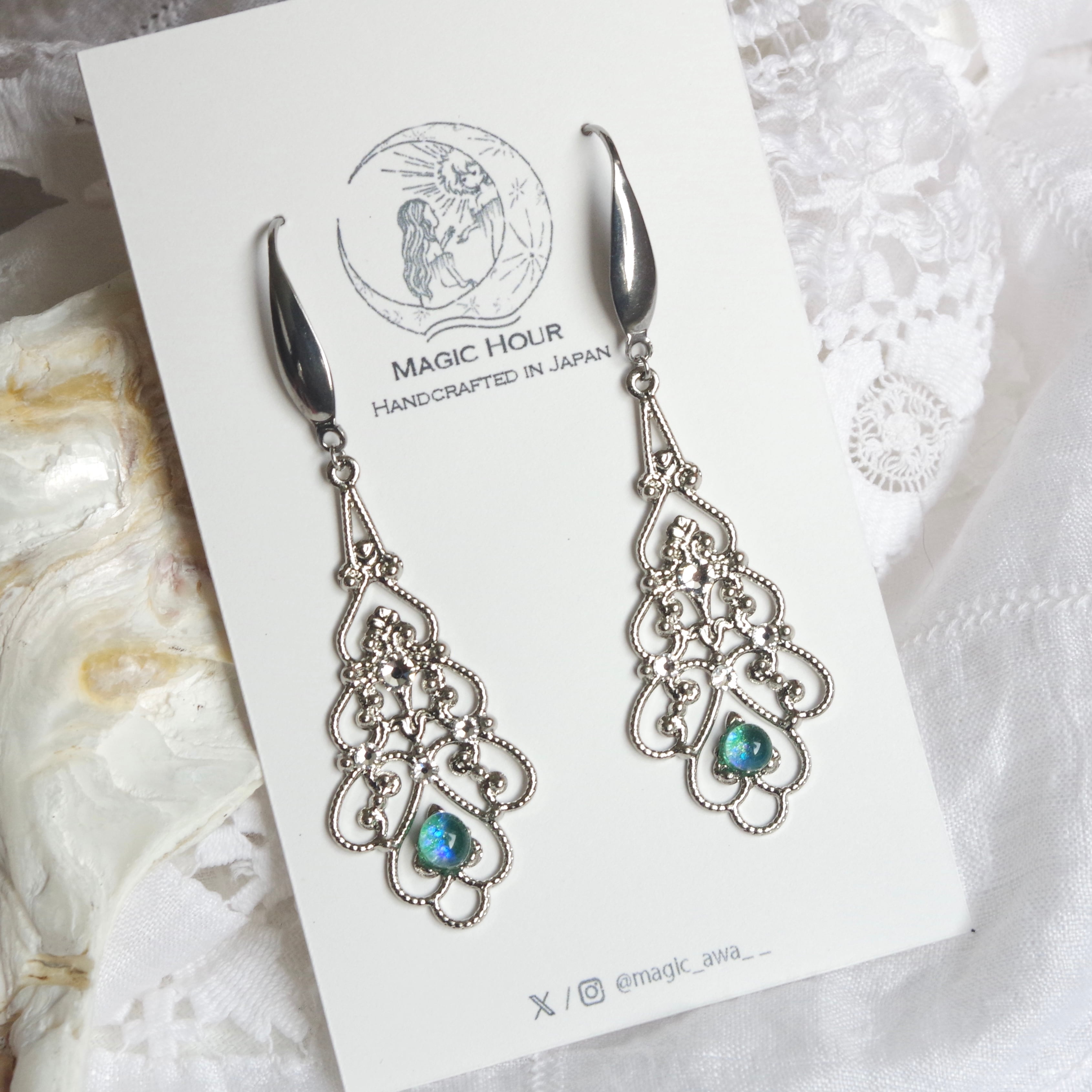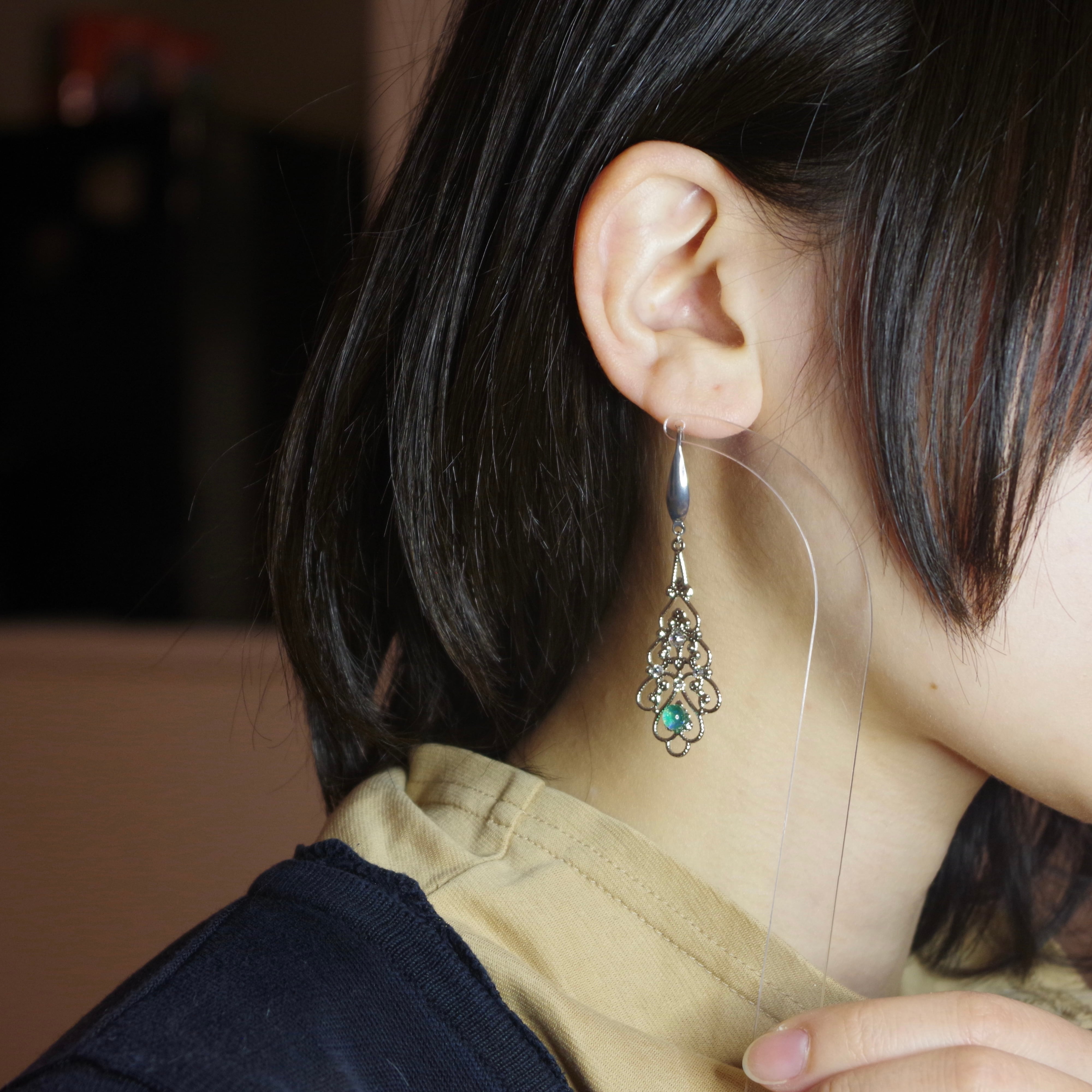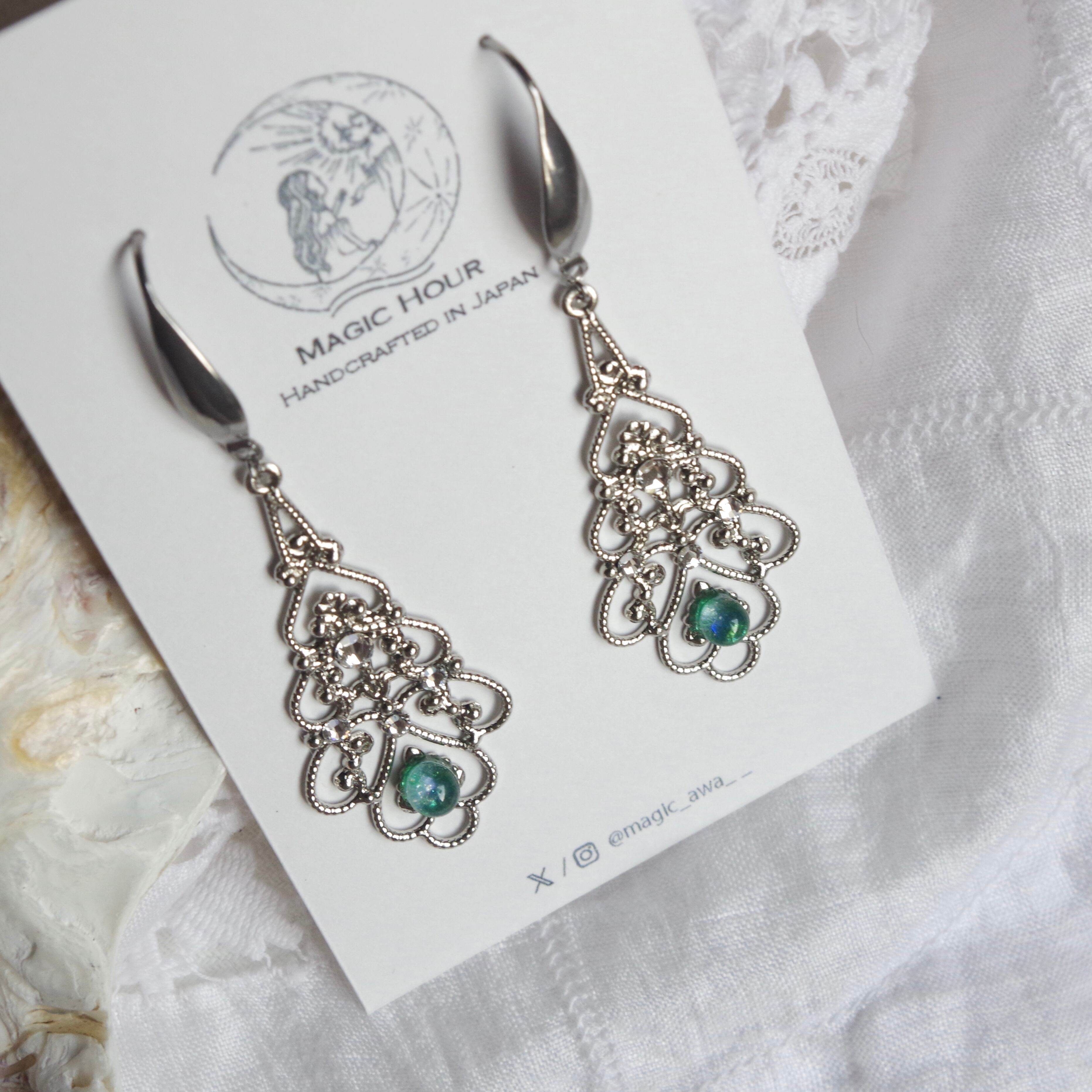 窯で焼いたシーグラスアイテムから、繊細なフィリグリーが美しい"Lune"シリーズが登場しました。スッと落ちる一筋の雫のように美しい耳飾り。