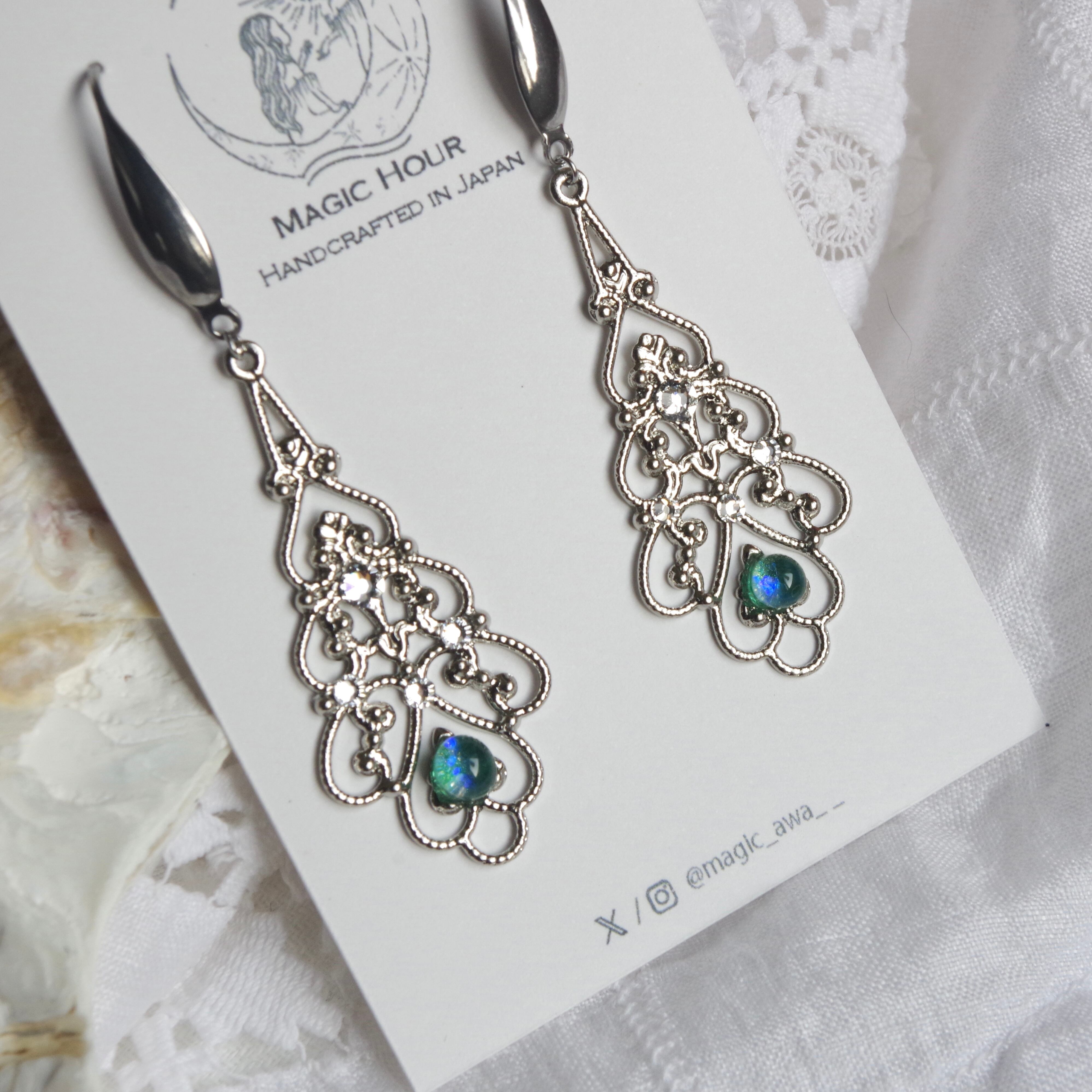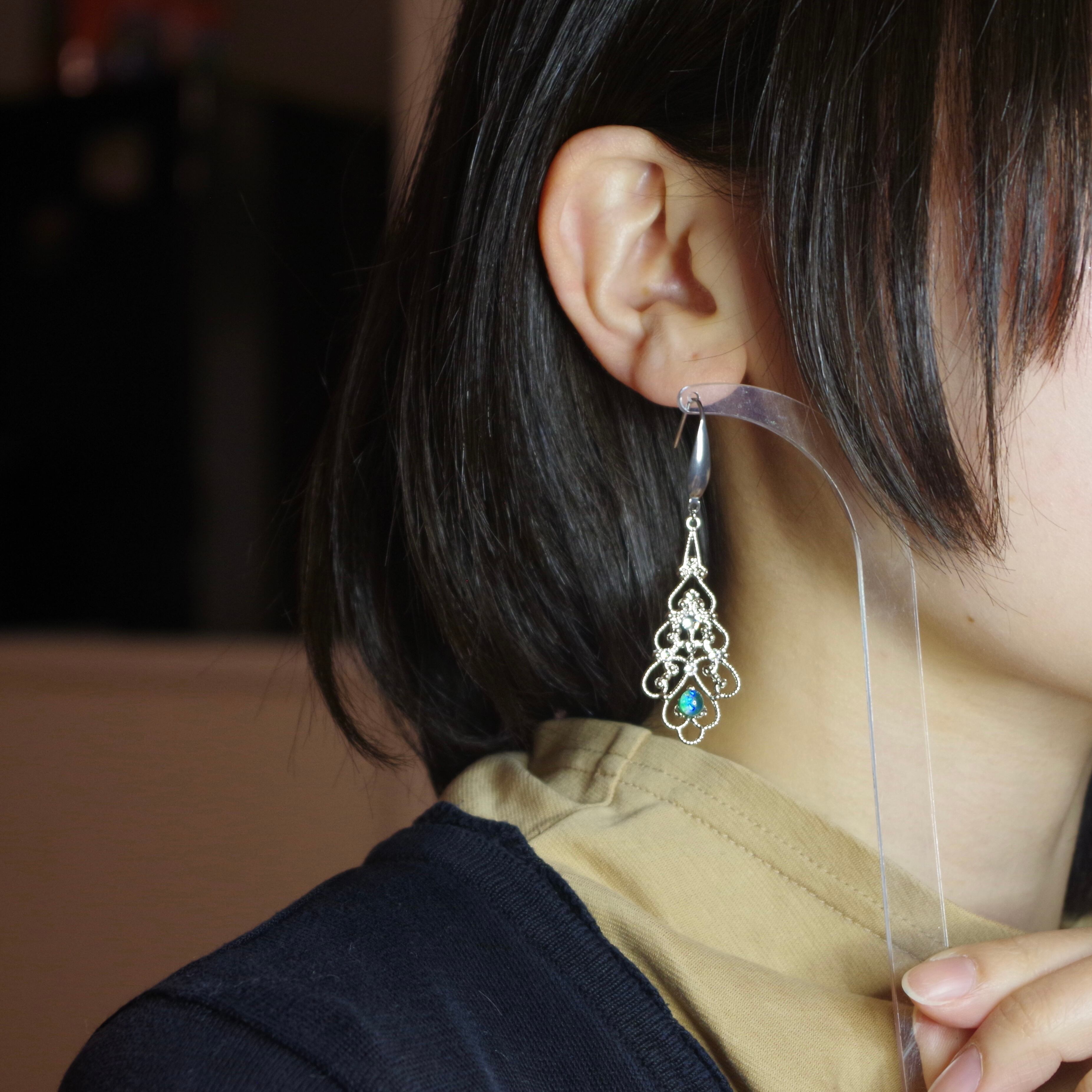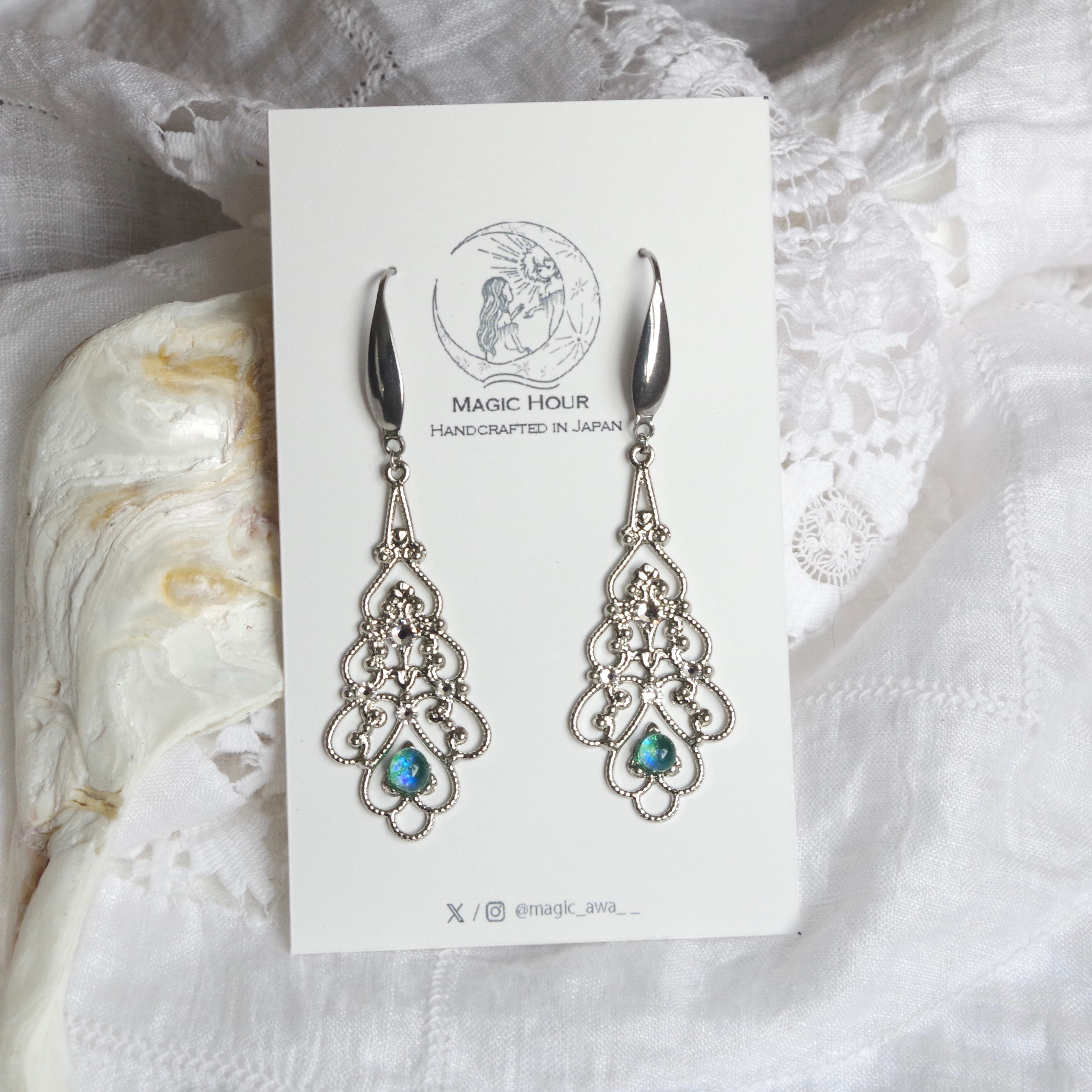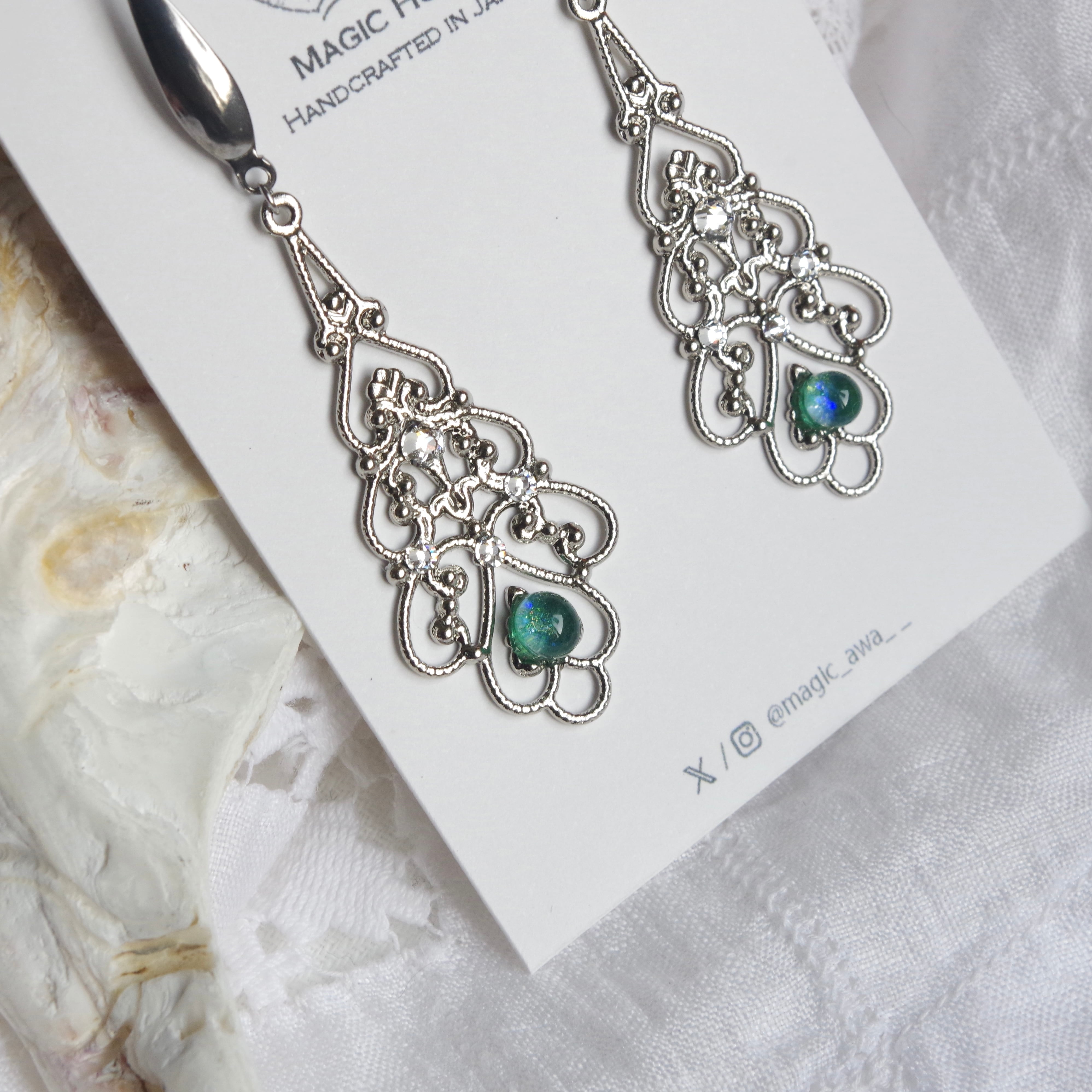 窯で焼いたシーグラスアイテムから、繊細なフィリグリーが美しい"Lune"シリーズが登場しました。スッと落ちる一筋の雫のように美しい耳飾り。